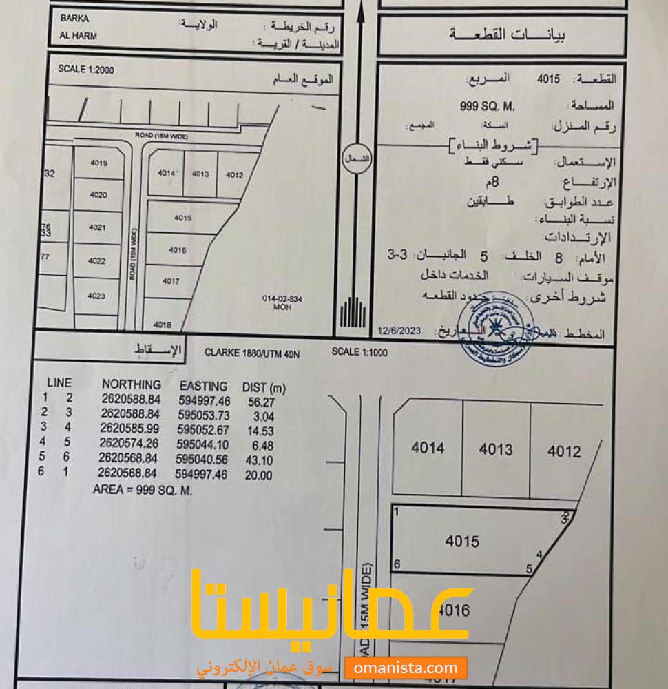 للبيع ارض سكنية ممتازة في بركاء الهرم الشمال زاوية ، رقم القطعة (4015) .