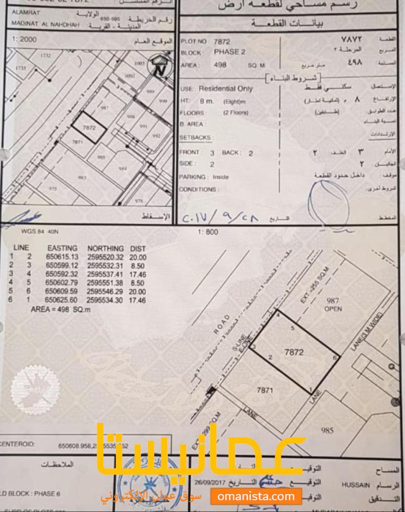 للبيع ارض سكنية ممتازة في العامرات مدينة النهضة السادسة البريد وسطية ، رقم القطعة (7872) .