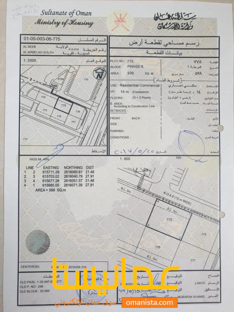 للبيع ارض سكنية تجارية ممتازة في السيب المعبيلة الجنوبية وسطية، رقم القطعة (775) .