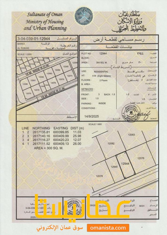للبيع ارض سكنية ممتازة في بركاء الرميس الجنوب مخطط الفليج وسطية ، رقم القطعة (12944) .