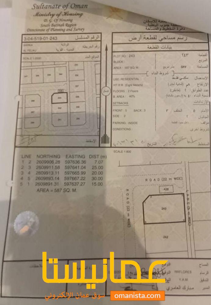 للبيع ارض سكنية ممتازة في بركاء الفليج المعمورة وسطية ، رقم القطعة (243) .