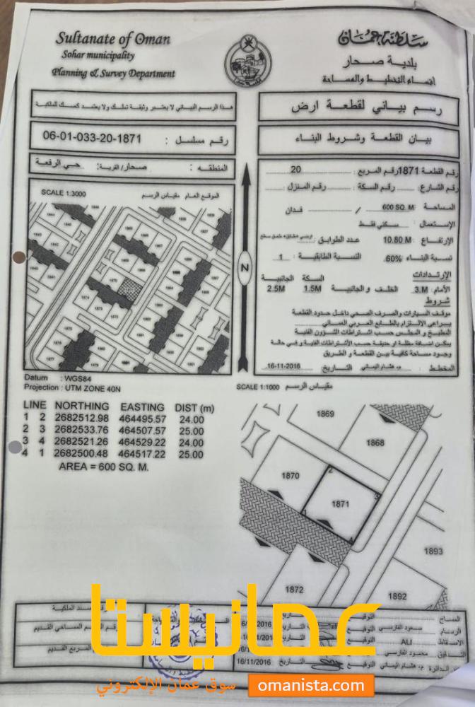 للبيع ارض سكنية ممتازة في صحار حي الرفعة سيح المكارم كونر، رقم القطعة (1871) .