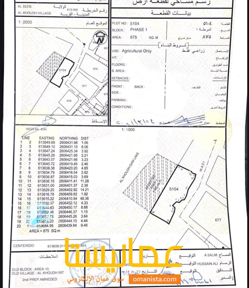 للبيع ارض زراعية ممتازة في السيب الخوض القديمة مقابل الوادي ، رقم القطعة (5104) .