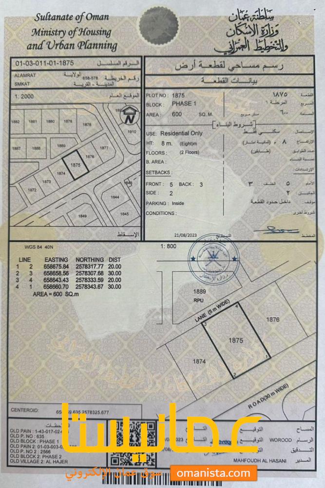 للبيع ارض سكنية ممتازة في العامرات سمكت وسطية رقم القطعة (1875) .