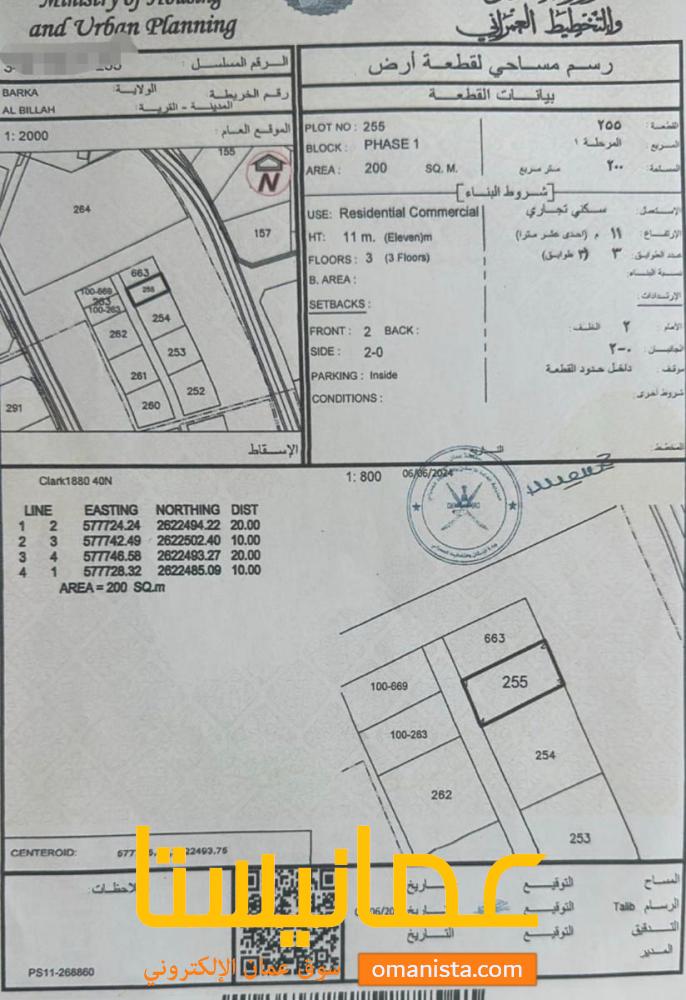 للبيع ارض سكنية تجارية ممتازة في بركاء البله وسطية، رقم القطعة (255) .