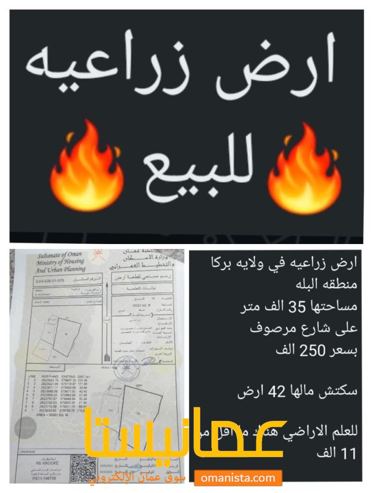 🔥للبيع🔥 ارض زراعيه في ولايه بركا منطقه البله مساحتها 35 الف متر على شارع مرصوف بسعر 250 الف سكتش مالها 42 ارض للعلم الاراضي هناك ما اقل من 11 الف الموقع https://maps.app.goo.gl/A7iR3iAaNCE8Bzi87?g_st=aw 92180540