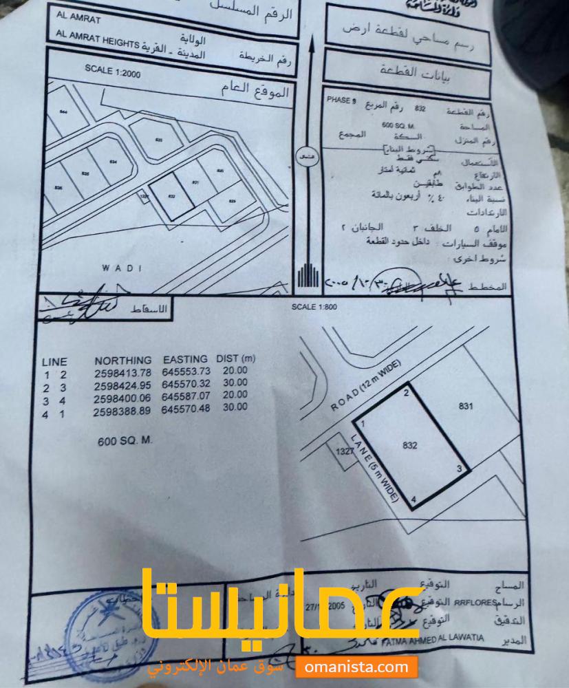 للبيع ارض سكنية ممتازة في مرتفعات العامرات التاسعة كونر ، رقم القطعة (832) .