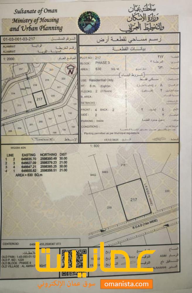 للبيع ارض سكنية ممتازة في مرتفعات العامرات التاسعة زاوية ، رقم القطعة (217) .