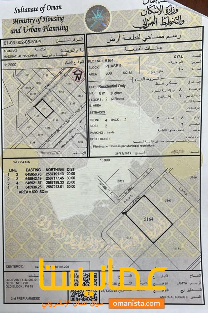 للبيع ارض سكنية ممتازة في العامرات مدينة النهضة مربع 18 وسطية ، رقم القطعة (5164) .