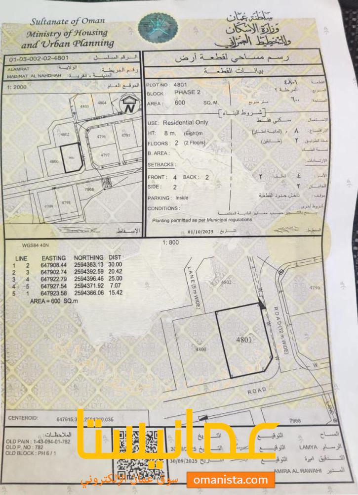للبيع ارض سكنية ممتازة في العامرات مدينة النهضة 6\1 كونر ، رقم القطعة (4801) .
