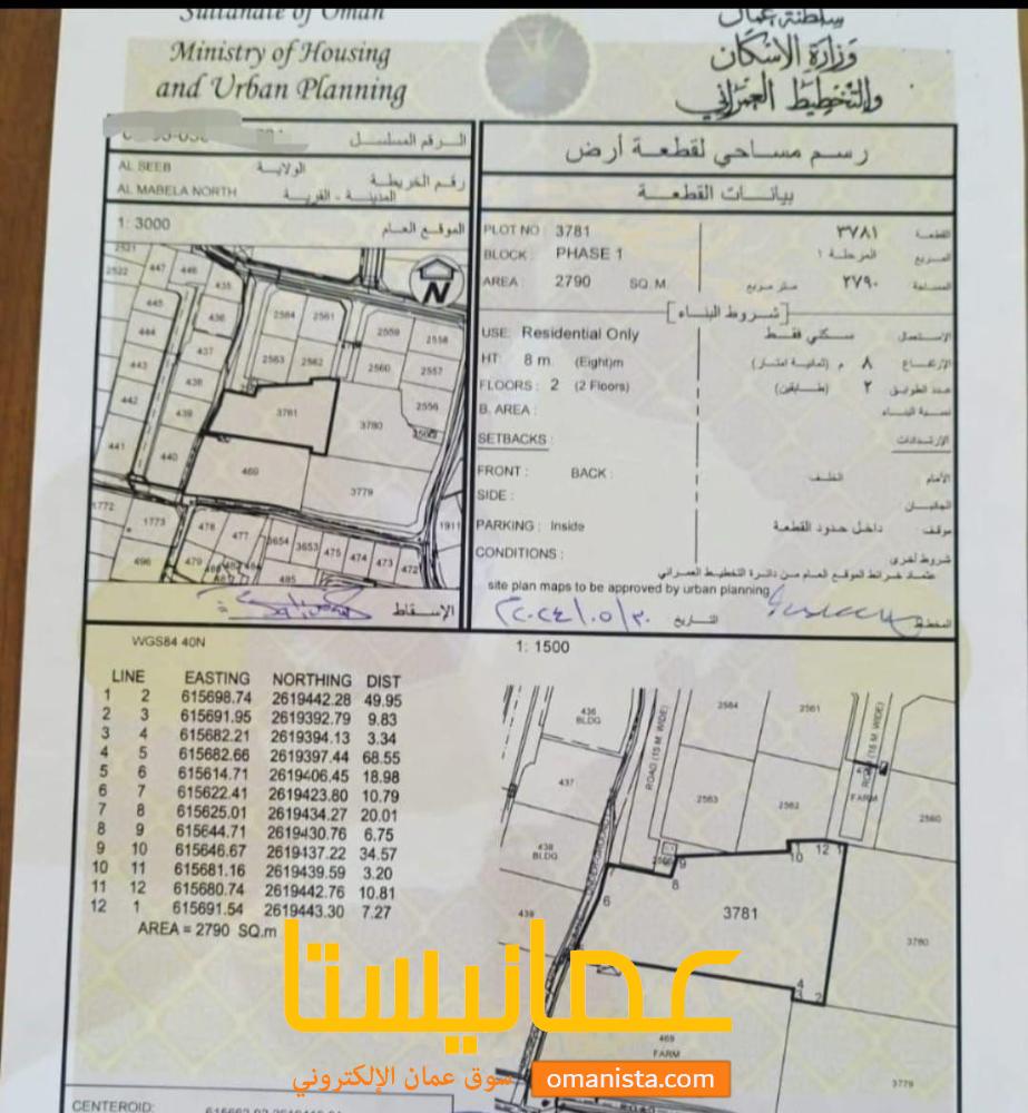 للبيع ارض سكنية ممتازة في السيب المعبيلة الشمالية وسطية ، رقم القطعة (3781) .