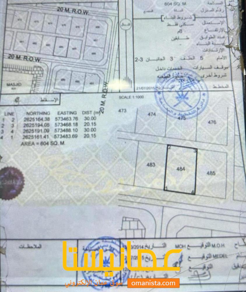 للبيع ارض سكنية ممتازة في بركاء السوادي الشمال وسطية ، رقم القطعة (484) .