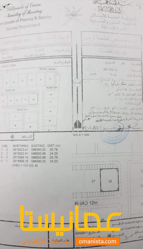 للبيع ارض سكنية تجارية ممتازة في بركاء حي عاصم سوبر كونر، رقم القطعة (26) .
