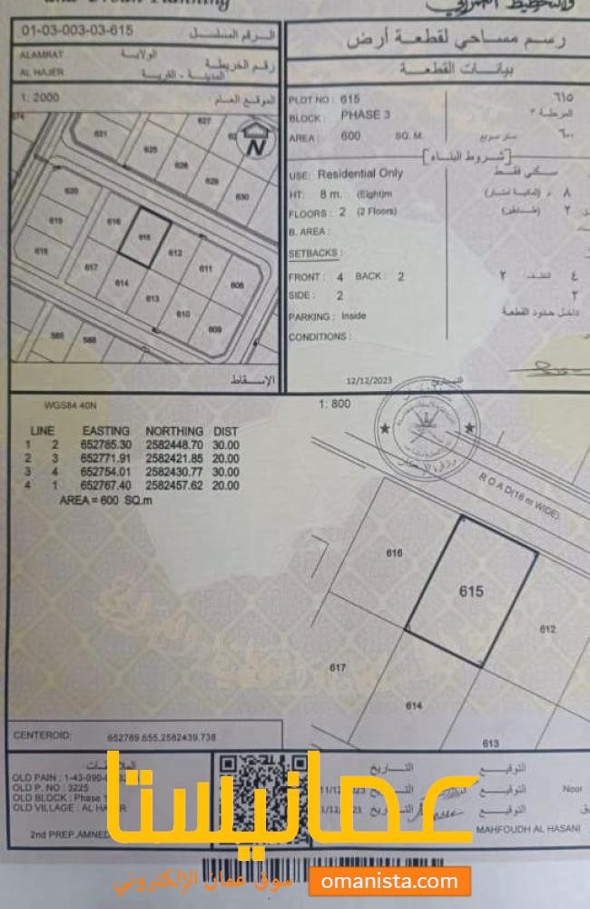 للبيع ارض سكنية ممتازة في العامرات الحاجر الاولى وسطية رقم القطعة (615) .