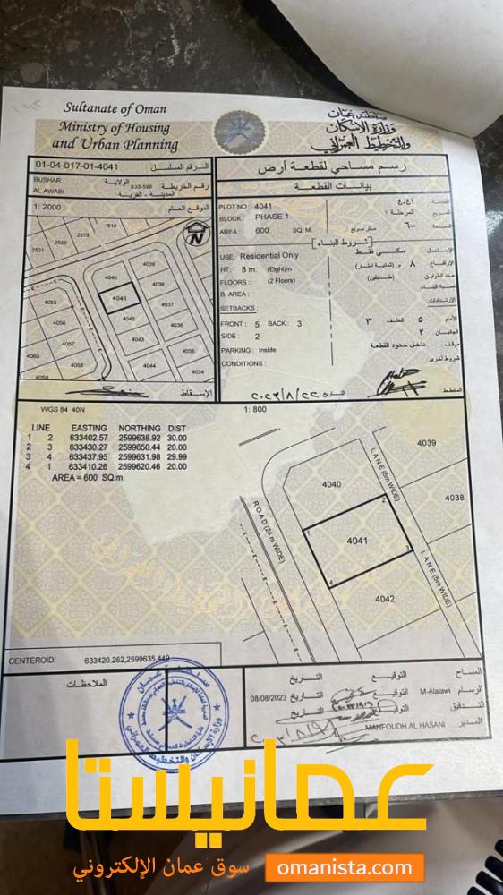 للبيع ارض سكنية ممتازة في بوشر العوابي الضباط وسطية ، رقم القطعة (4041) .