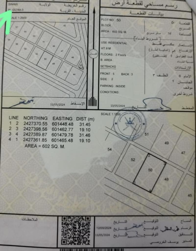 ارض سكنية ولاية سناو مربع الجزع 3 رقم قطعة الارض 50 الارض و