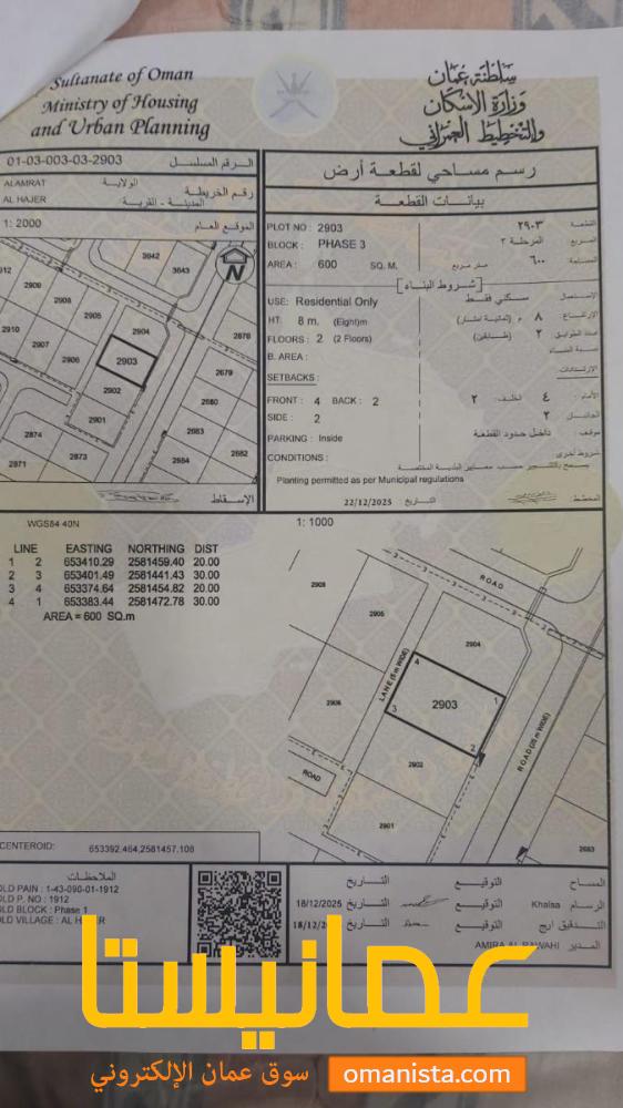 للبيع ارض سكنية ممتازة في العامرات الحاجر الاولى وسطية رقم القطعة (2903) .