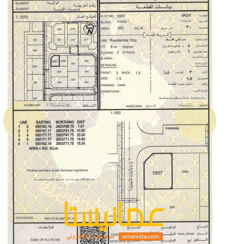 للبيع ارض سكنية ممتازة في مرتفعات العامرات الثامنة كونر رقم القطعة (5957) .