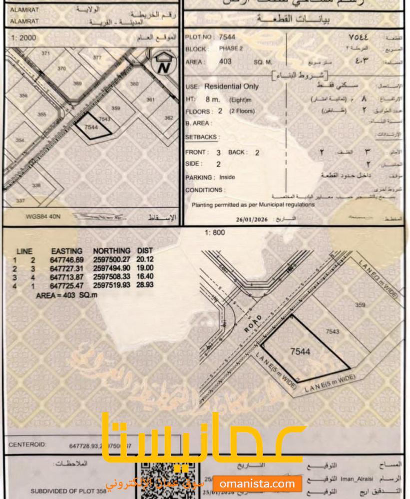 للبيع ارض سكنية ممتازة في مرتفعات العامرات مرحلة الثانية زاوية رقم القطعة (7544) .