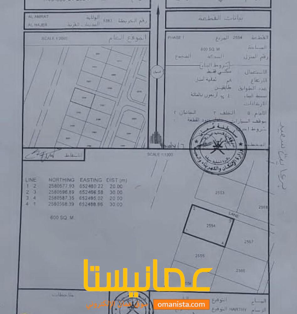 للبيع ارض سكنية ممتازة في العامرات الحاجرالمرحلة الاولى زاوية رقم القطعة (2554) .