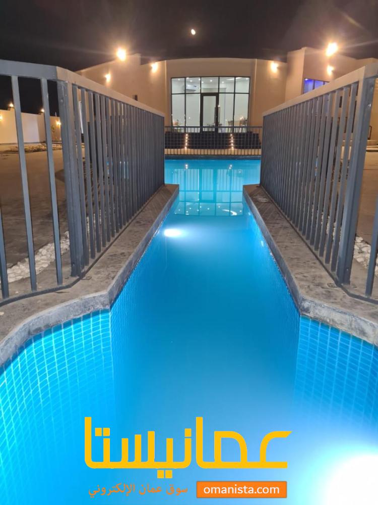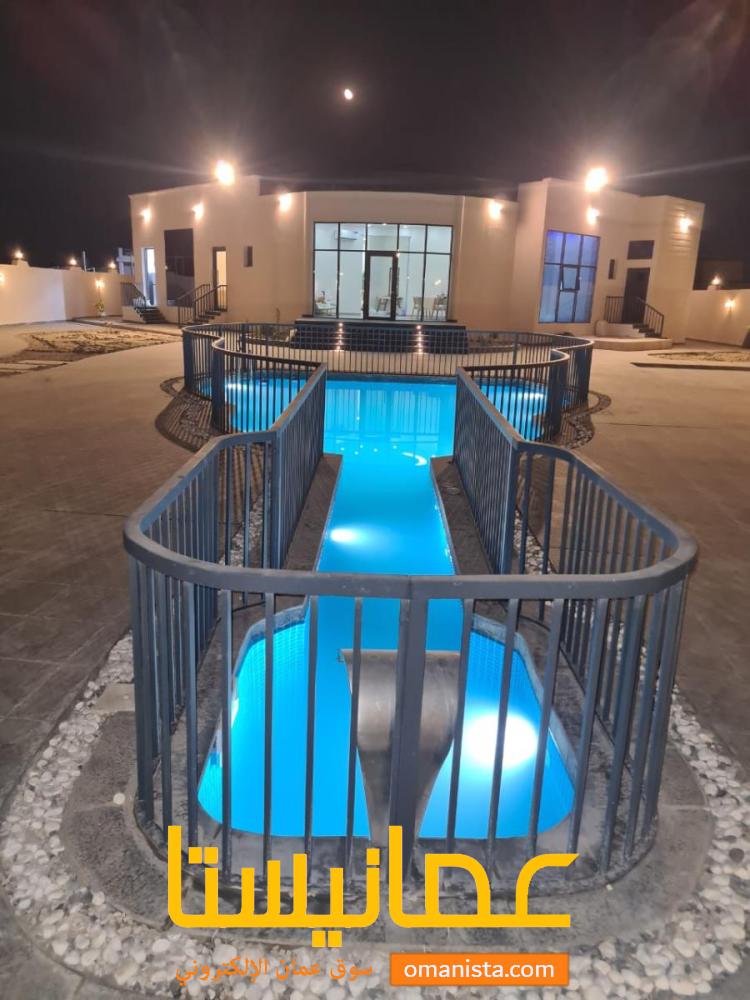 * بركة سباحة خارجية كبيرة مع فلترات وتدفئة وحواجز حماية لضمان الأمان