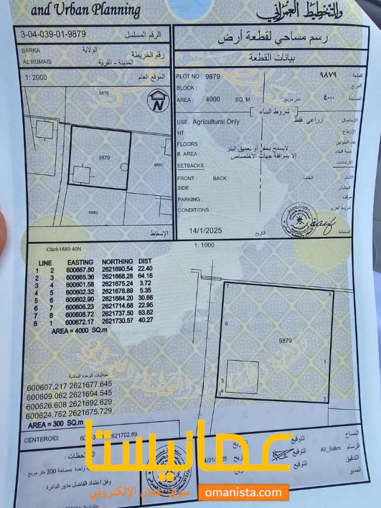 مباشرة على شواطئ ولاية بركاء منطقة الرميس مس ٤٠٠٠متر يبعد عن البحر ١٠٠ متر فقط يبعد عن الشارع البحري ٥٠ متر تبعد المعبيله ١٠ دقايق مقابل مشروع النخيل السياحي