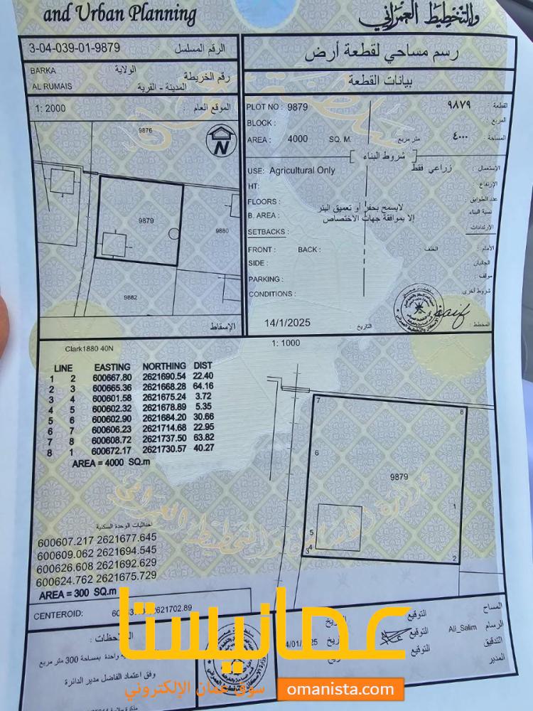 للبيع ارض زراعية فضاء ممتازة في ولاية بركاء الرميس الشمال ، رقم القطعة (9879).