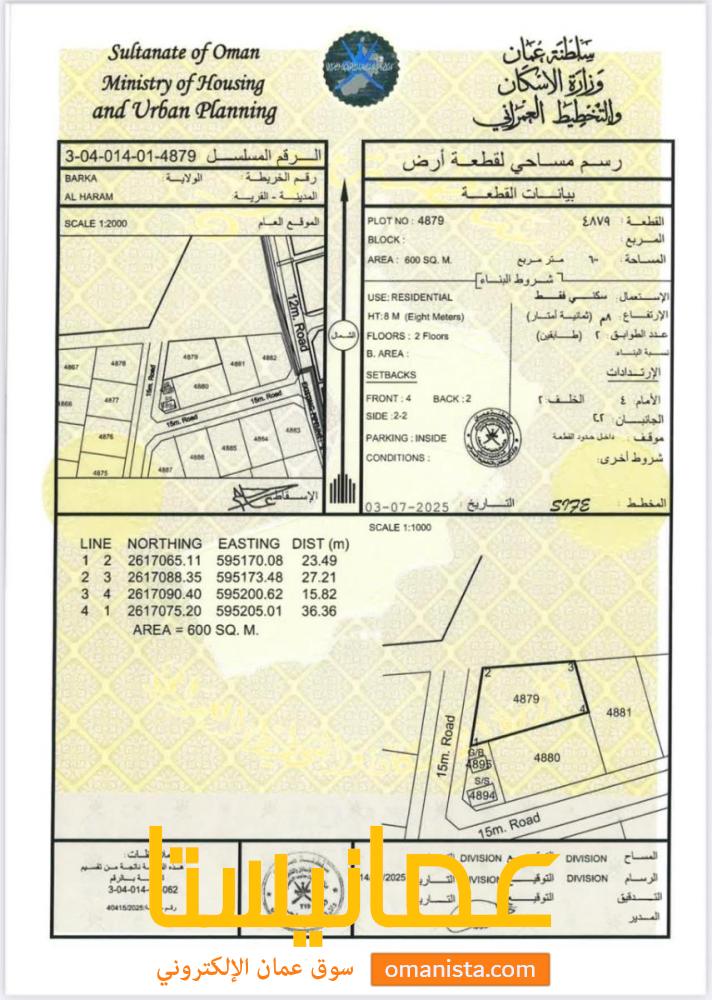 للبيع ارض سكنية ممتازة في بركاء الهرم كونر رقم القطعة (4879) .