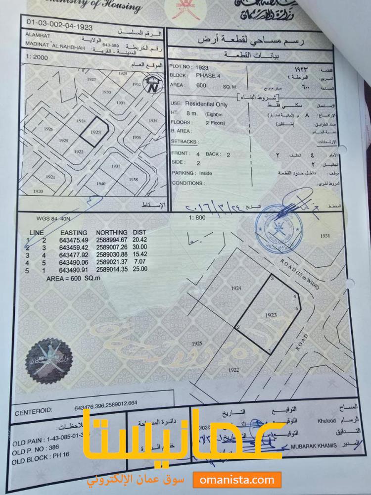 للبيع ارض سكنية ممتازة في العامرات مدينة النهضة مربع 16 كونر رقم القطعة (1923) .