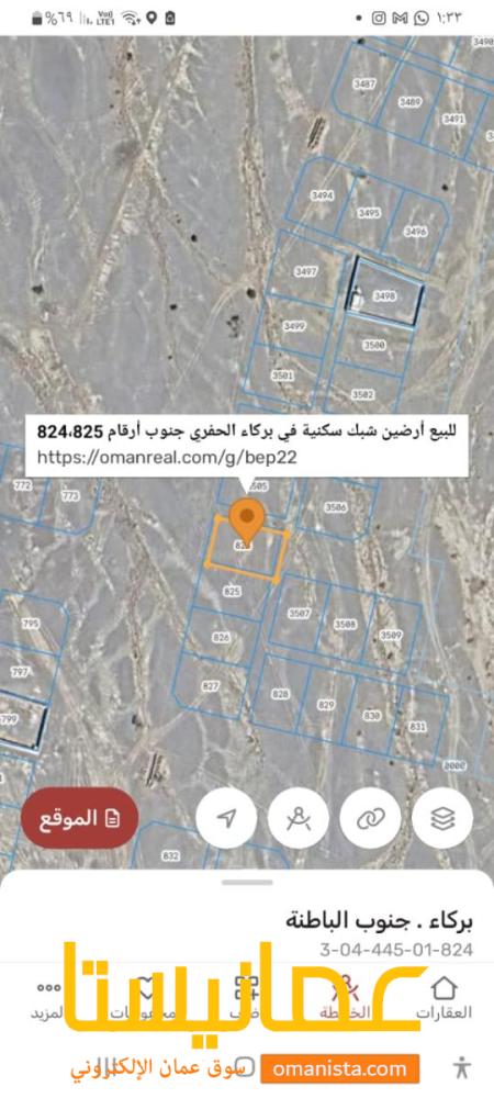 _ للبيع ارضين شبك سكنية ممتازة ، في بركاء الدهس في الحفري جنوب ، قريب من مسجد أبو بكر ، أرقام القطع ( 824، 825)