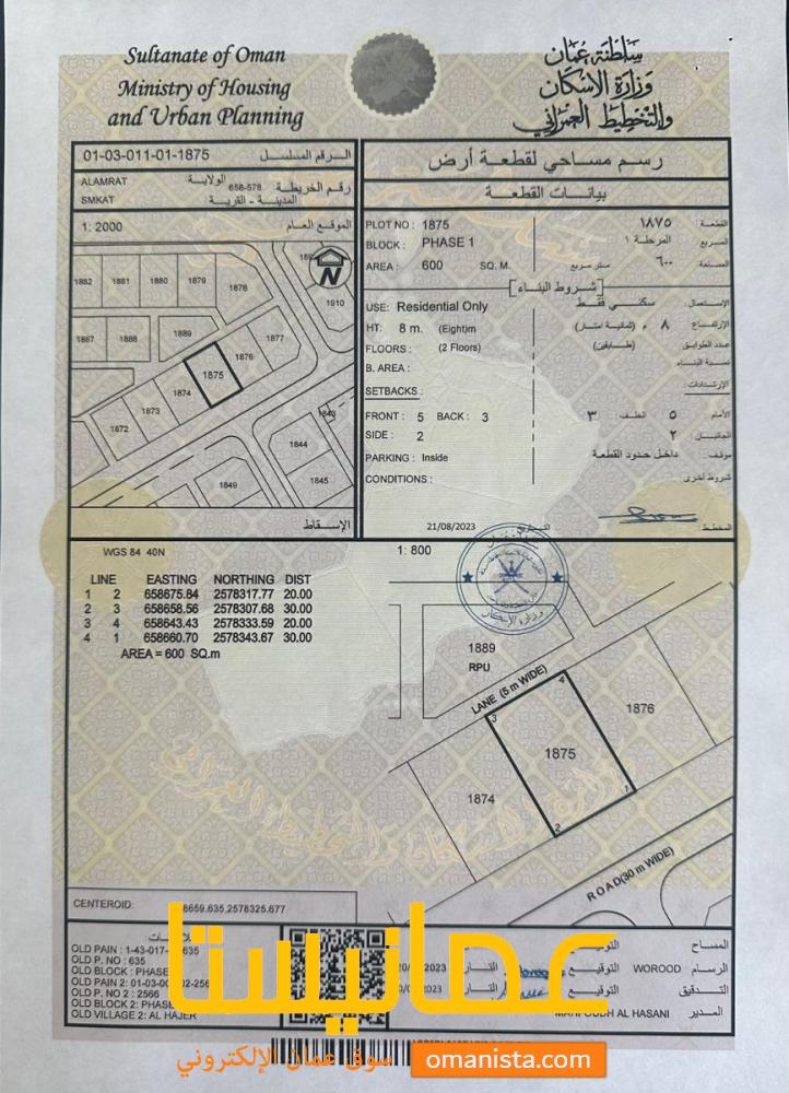 للبيع ارض سكنية ممتازة في العامرات مربع سمكت وسطية ، رقم القطعة (1875) .
