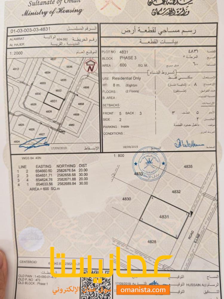 للبيع ارض سكنية ممتازة في العامرات الحاجر الاولى وسطية ، رقم القطعة (4831) .