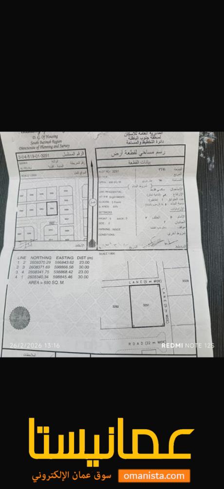 للبيع ارض سكنية ممتازة في بركاء الفليج المعمورة زاوية ، رقم القطعة (3291) .