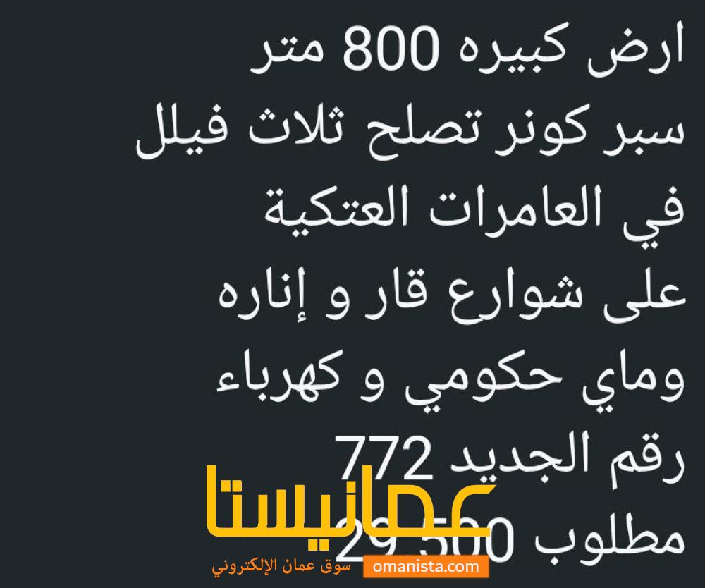 🔥للبيع🔥 من المالك و الملك لله ارض كبيره 800 متر سوبر كونر تصلح ثلاث فيلل (في العامرات العتكية) على شوارع قار و إناره وماي حكومي و كهرباء رقم الجديد 772 مطلوب 29.500 https://omanreal.com/g/bewzs 92180540