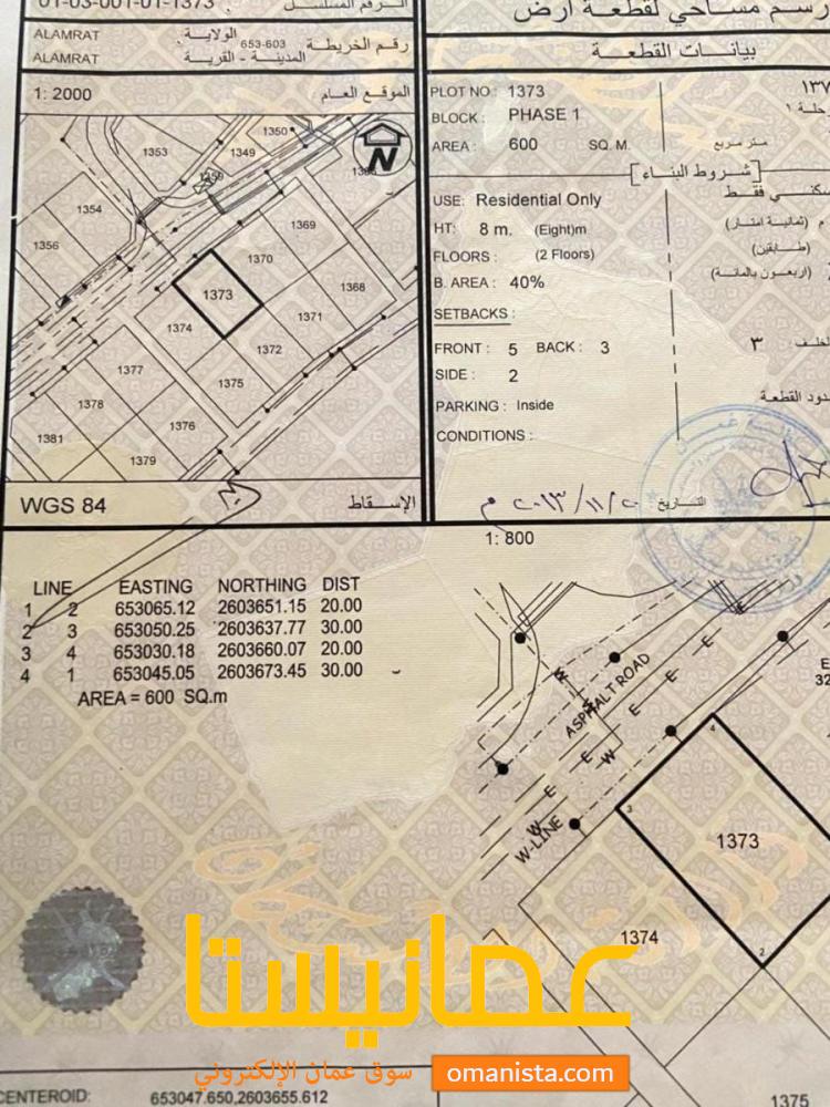 للبيع ارض سكنية ممتازة في مرتفعات العامرات الخامسة وسطية ، رقم القطعة (1373) .