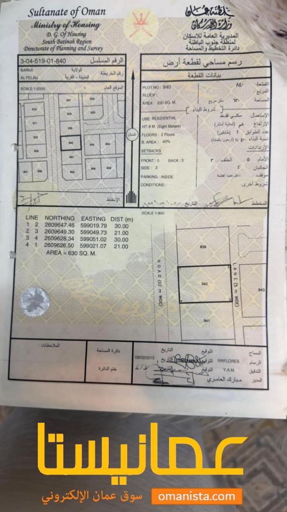 للبيع ارض سكنية ممتازة في بركاء الفليج المعمورة وسطية ، رقم القطعة (840) .