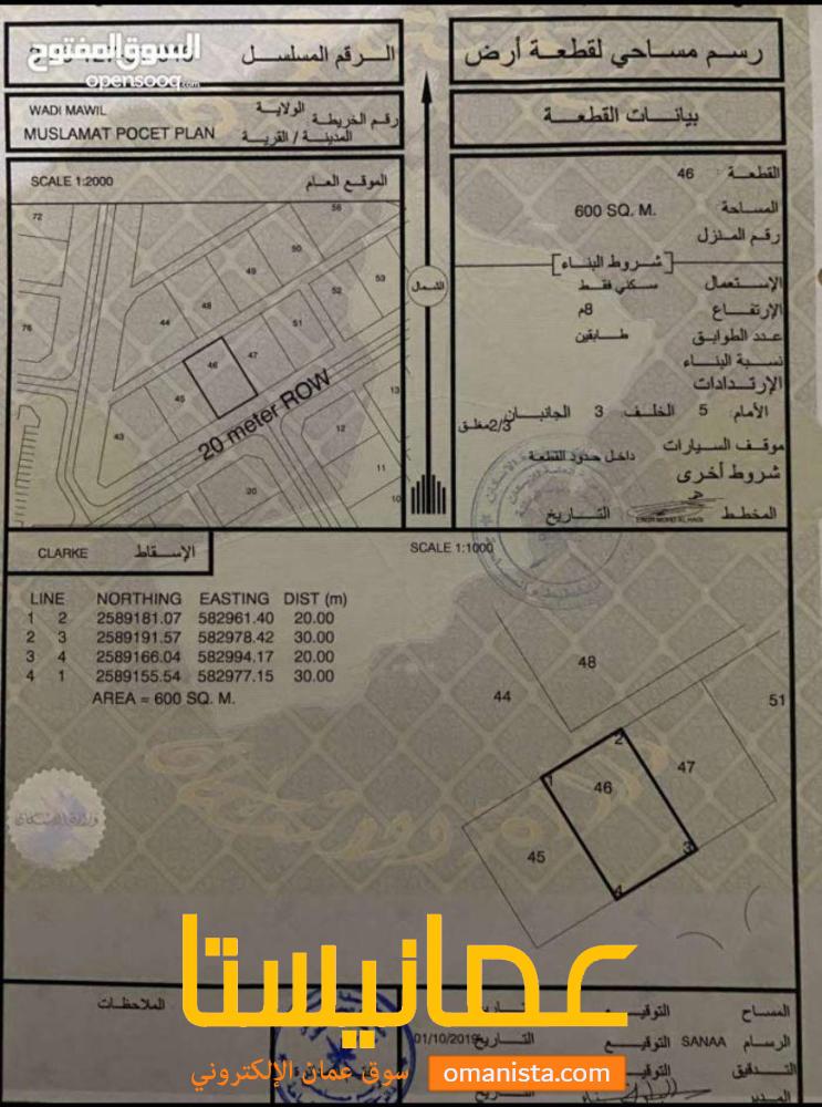 للبيع ارض سكنية ممتازة في وادي المعاول مسلمات وسطية ، رقم القطعة (46) .
