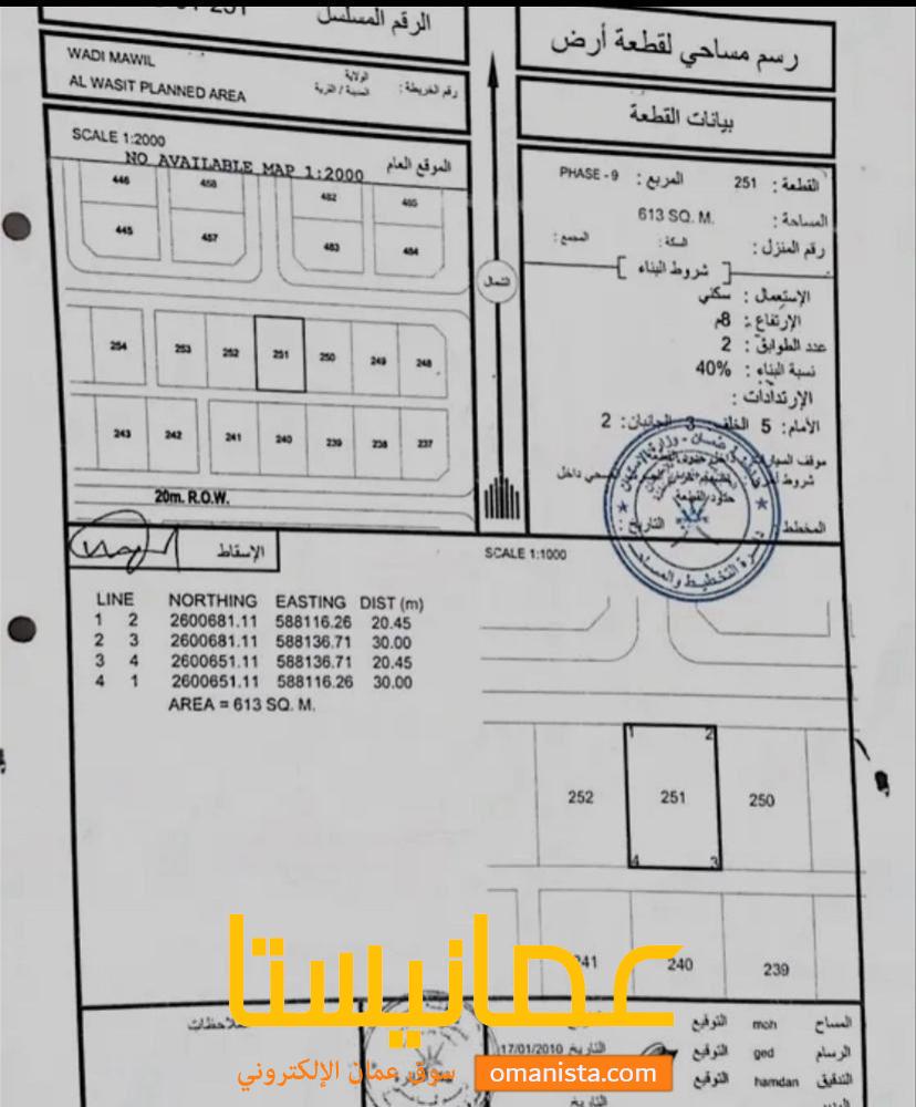 للبيع ارض سكنية ممتازة في وادي المعاول الواسط التاسعة وسطية ، رقم القطعة (251) .