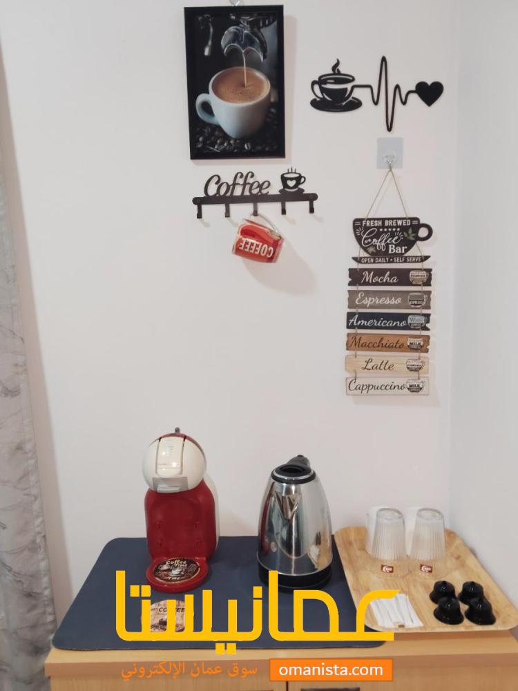 فيها مكينة قهوة وسخانة شاي وصحون ومقامش