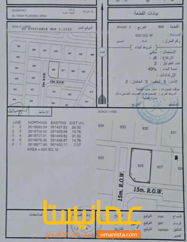 للبيع ارض سكنية ممتازة في المصنعة الطريف 2 الجنوب كونر ، رقم القطعة (928) .