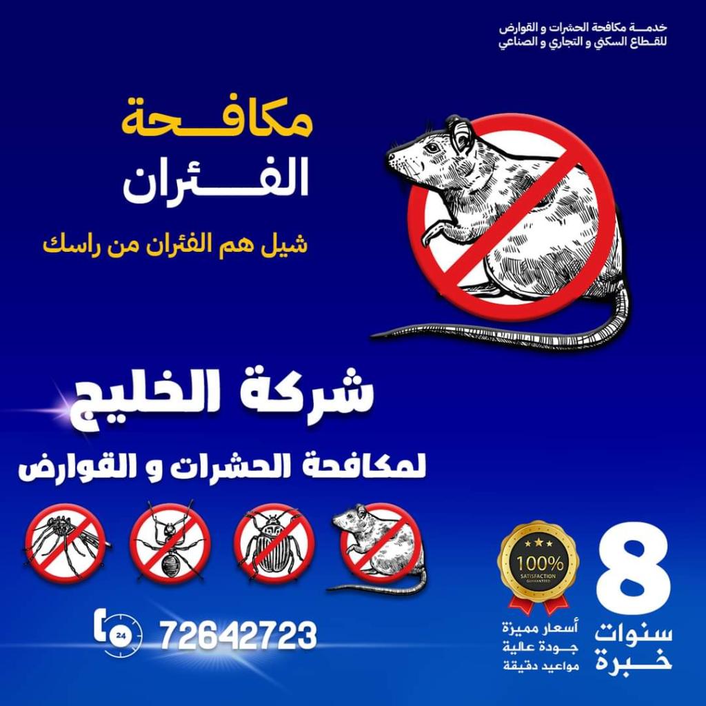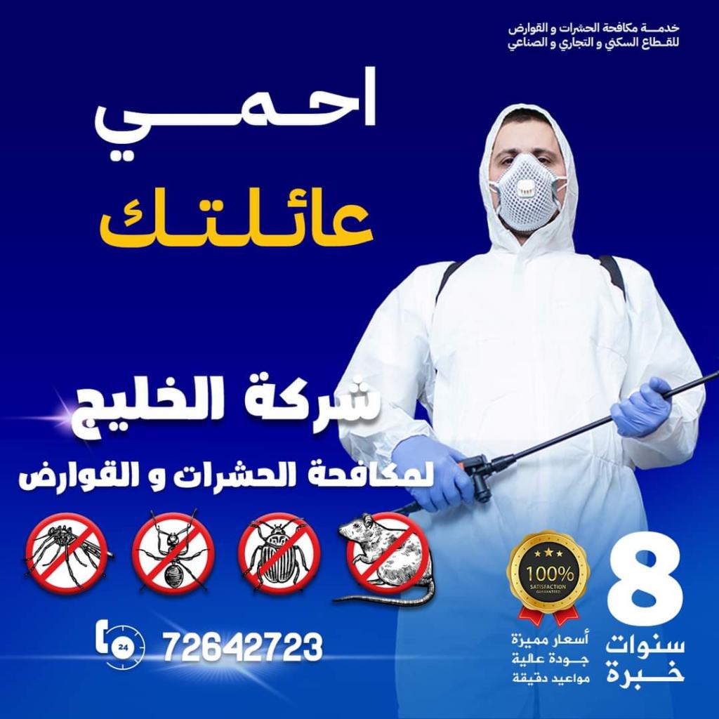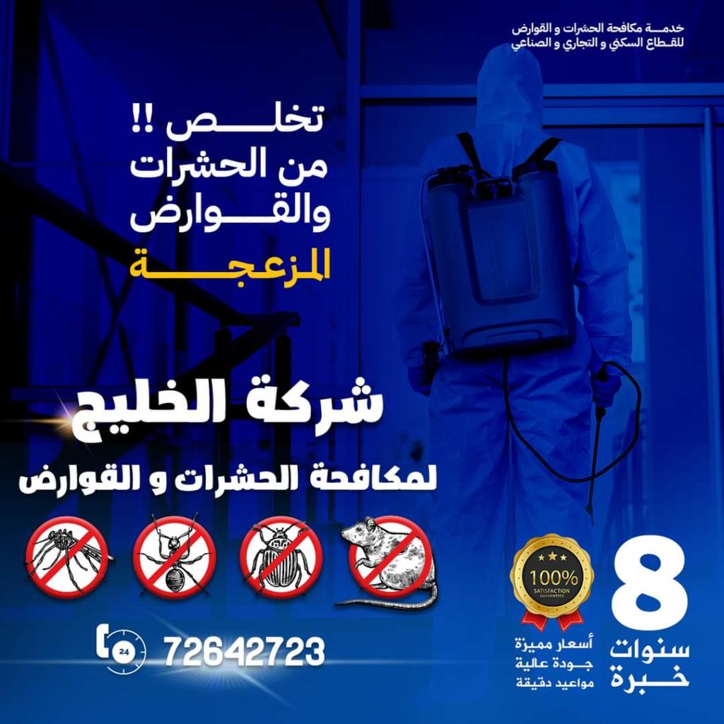 شركة الخليج لمكافحة الحشرات والقوارض خبرة أكثر من ١٠ سنوات فى مكافحة جميع الحشرات والقوارض بأنواعها والأفاعى والعفاريت من أجل صحتك وامان أسرتك نستخدم أقوى المبيدات الامنه للقضاء على الحشرات مثل الصراصير بأنواعها والنمل وبق الفراش وسوس الخشب والرمة ومكافحة الفئران والأفاعى والأقارب والبرص والسحلية بمواد عالية الجودة وق ية المفعول يتما القضاء عليها من قبل متخصصين