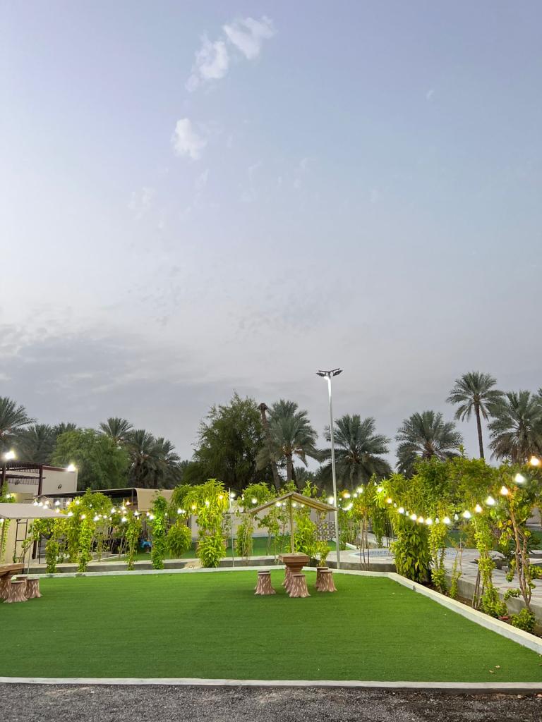 استراحة واسعه تحيط بها أشجار النخيل يوجد مجلسين واسعين للرجال والنساء يوجد غرفتين للنوم مفروشات يوجد قاعه كبيرة مكيفه للحفلات والمناسبات والعاب التسلية يوجد بها ثلاثه أحواض للرجال والاطفال والنساء حوض مغلق مكيف يوجد مطبخ به طباخات وثلاجات وجلسات خارجية والعاب بلاستيكية للأطفال ويوجد نوافير وشلالات مائيه وملاعب ترتان لكرة القدم وكرة الطائرة