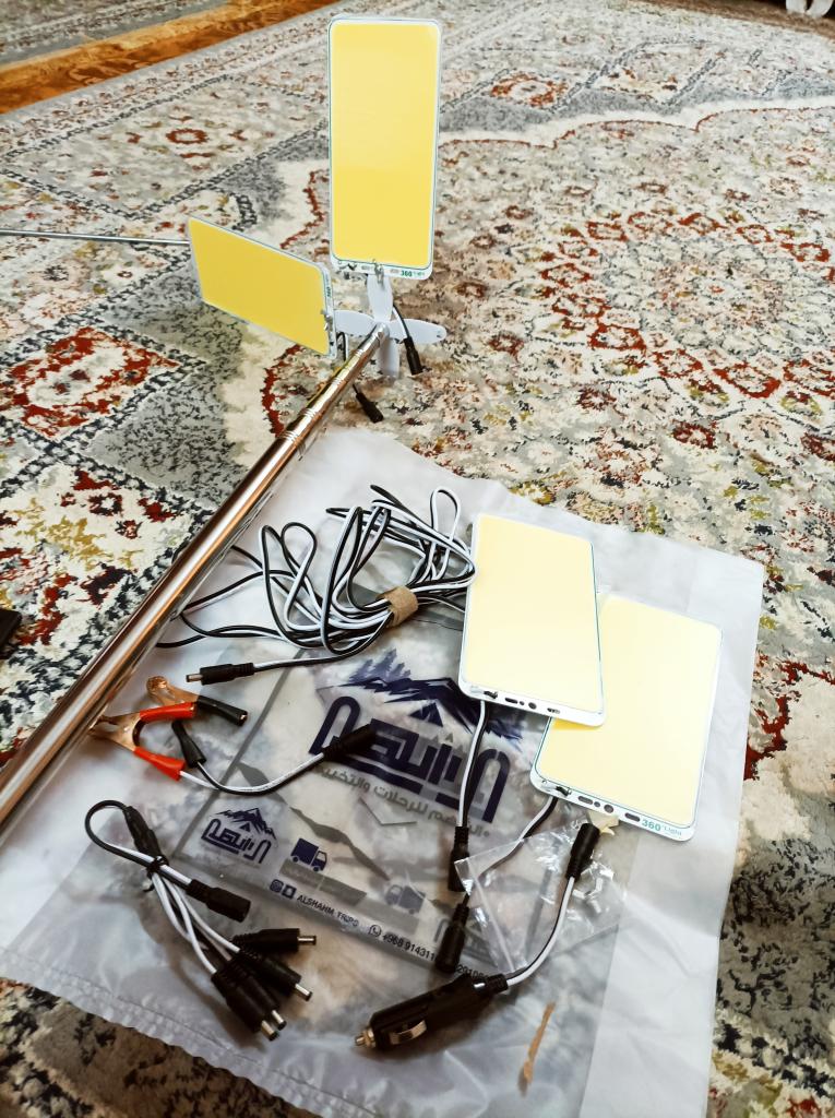 إنارة أل دي دي سنارة مناسبة للرحلات ،ارتفاع ٣متر تقريبا ،٤ ألواح ذات وصلات بطول مناسب ،يأتي معها قاعدة تثبيت والأرضية وآخرى تثبيت فالرمل ،وصلة لبطارية السيارة ،وأخرى لولاعة الداخلية