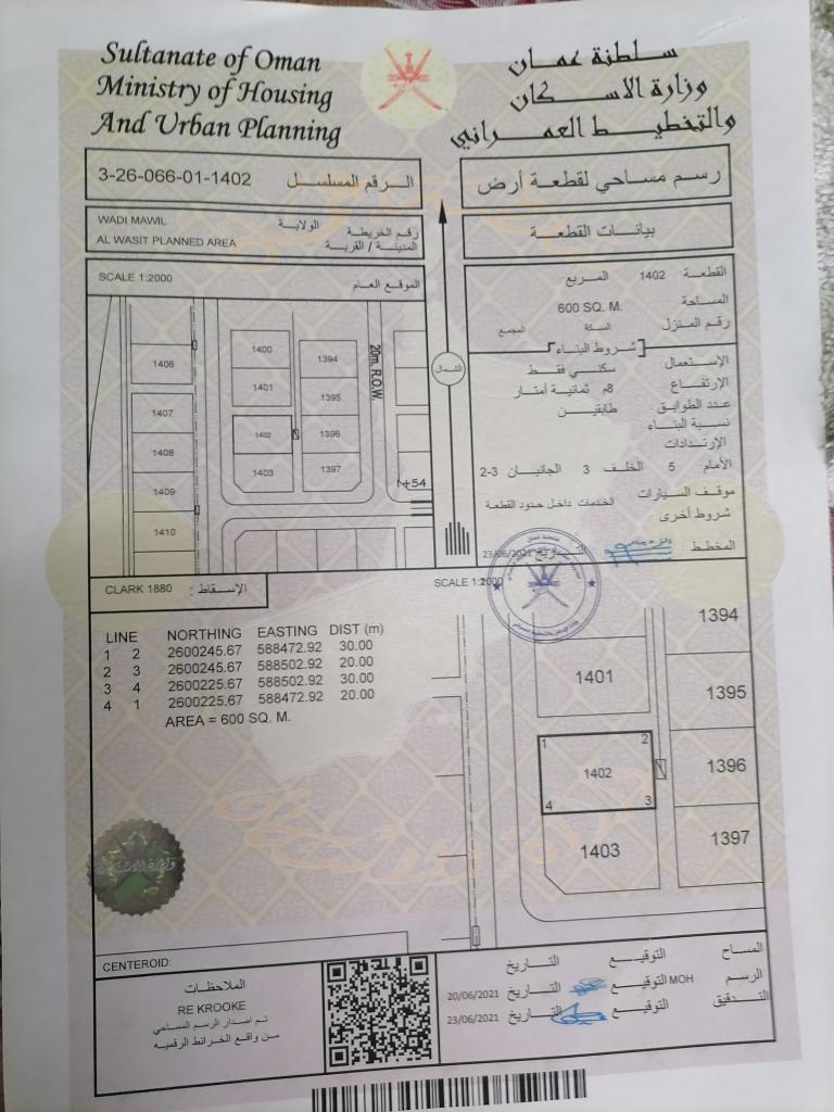 للبيع ارض سكني بولاية وادي المعاول / الواسط مقابل مركز المهام الخاصة رقم القطع: 1402 المساحة: (600 ) متر مربع. القيمة: 15000 الف. قابل للتفاوض الموقع حسب ما هو موضح في الاحداثيات في الكروري المرفق للاتصال: 94368000