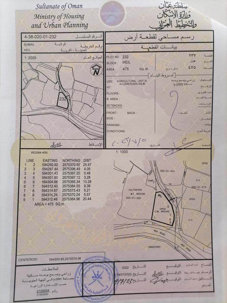 ارض زراعية مسوح بناء وحدة سكنية 200 متر بولاية سمائل / هيل