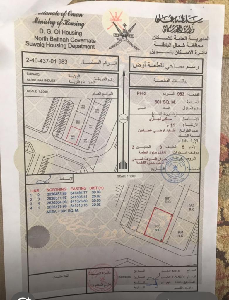 سكني تجاري كورنر (على شارعين وسكة) في صناعية السويق الثالثة أمام ملعب فريق السويق مباشرة رقم 983 مساحتها 601م على ثاني خط من الشارع الرئيسي (السويق-الرستاق) بسعر 27 ألف.