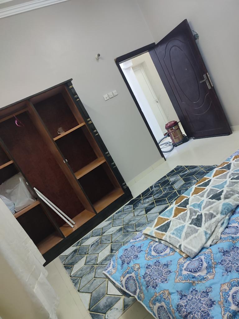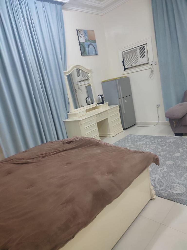 غرفة نوم بدورة مياه ومطبخ صغير به غسالة وثلاجة