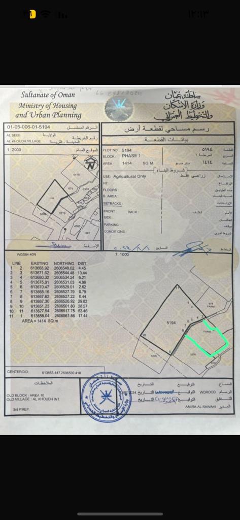 *`ارض زراعية في مسقط في قرية الخوض ع الخط الاول من وادي الخوض مساحتها 1923 متر مربع`*