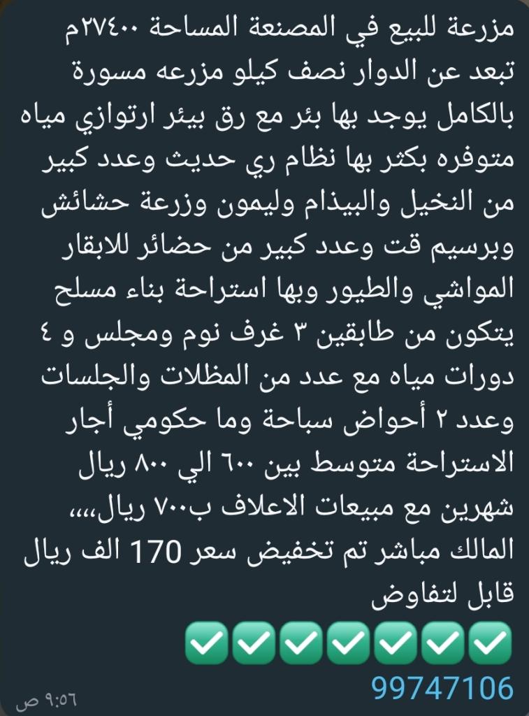 مزرعة للبيع في المصنعة المساحة ٢٧٤٠٠م تبعد عن الدوار نصف كيلو مزرعه مسورة بالكامل يوجد بها بئر مع رق بيئر ارتوازي مياه متوفره بكثر بها نظام ري حديث وعدد كبير من النخيل والبيذام وليمون وزرعة حشائش وبرسيم قت وعدد كبير من حضائر للابقار المواشي والطيور وبها استراحة بناء مسلح يتكون من طابقين ٣ غرف نوم ومجلس و ٤ دورات مياه مع عدد من المظلات والجلسات وعدد ٢ أحواض سباحة وما حكومي أجار الاستراحة متوسط بين ٦٠٠ الي ٨٠٠ ريال شهرين مع مبيعات الاعلاف ب٧٠٠ ريال،،،، المالك مباشر تم تخفيض سعر 170 الف ريال قابل لتفاوض
