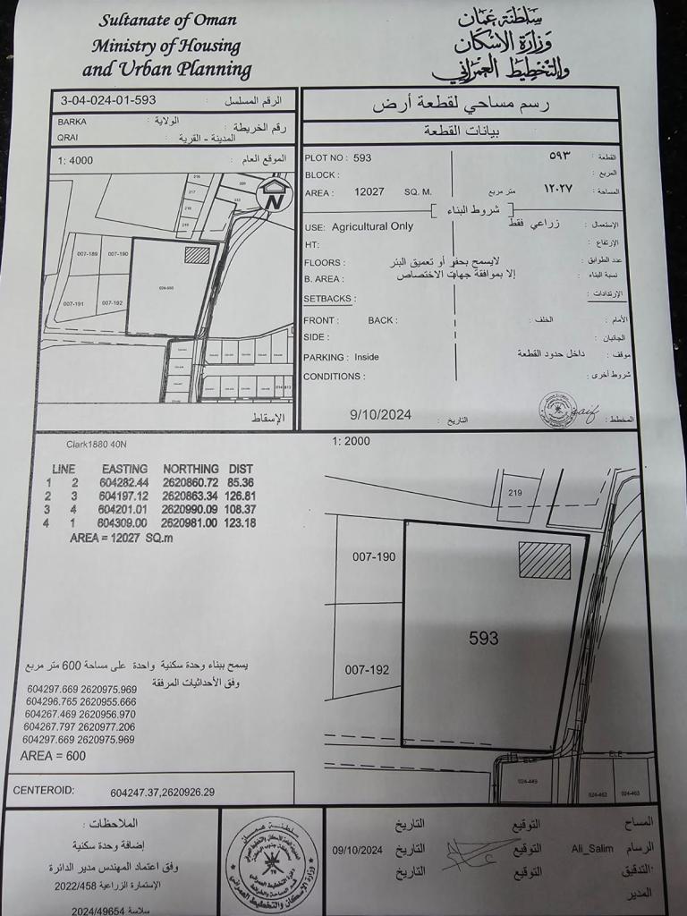*فرصه من ذهب لشراء ارض زراعيهه قريبه من مسقط 12027 متر مصرحه لوحده سكنيه*